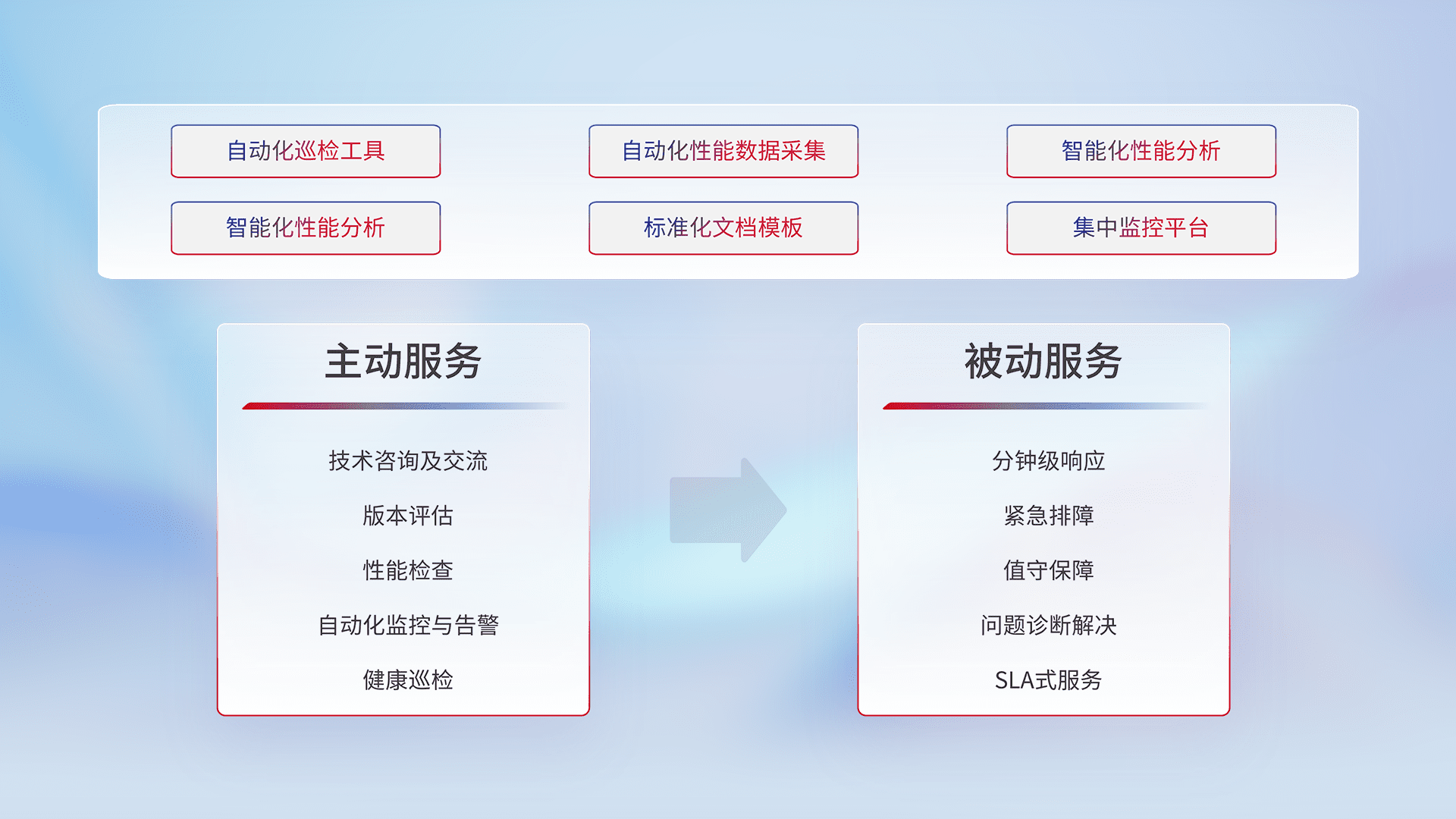 智能化工具和标准化文档,,保障服务质量,,,提供主动服务(包含技术咨询、、、版本评估、、、、性能检查、、、、自动化监控与告警、、、、健康巡检)和被动服务包含(分钟级响应、、紧急排障、、、值守保障、、、问题诊断解决、、SLA服务)。。